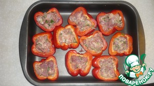 Маринованное мясо раскладываем по перцам. Добавляем воду и ставим в разогретую до 180 духовку на 30-35 минут.