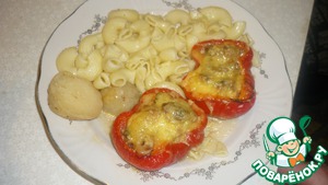 Пока мясо маринуется, режем перец пополам, желательно так, чтобы разрезанные половинки стояли ровно и не было дырок. Вычищаем. Выкладываем в глубокую посуду, пригодную для духовки. В каждый перчик кладем кусочек сливочного масла (5-10 гр.)