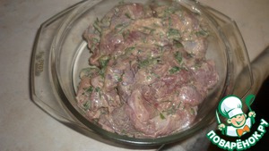 Нарезаем мясо небольшими кусочками. Маринуем в приправах (кто какие любит) + соль 3-4 часа. Не лишним будет посыпать, если есть, рубленой свежей зеленью. Если нет времени, можно добавить чуть майонеза, тогда мариновать минут 30.