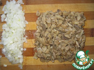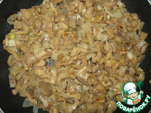 Приготовим начинку. Смешаем яйца с обжаренными грибами и луком, подсолим