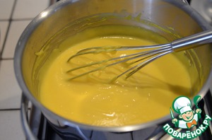 Перемешиваем и ставим на медленный огонь, непрерывно помешивая. С момента закипания варим крем около 5 минут до загустения.