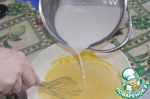 Растираем сахар с желтками. Добавляем муку и вот здесь, для лучшего смешивания ингредиентов, вливаем 3 ложки холодного молока, отложенного вначале. Затем постепенно тонкой струйкой вливаем горячее молоко.