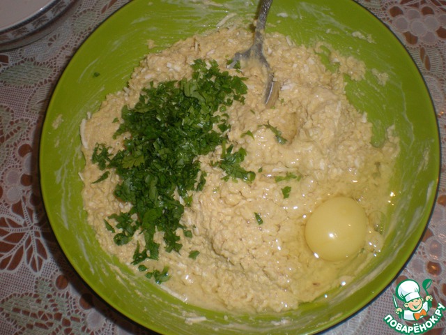 Теперь очередь зелени и яйца. тесто получается очень аппетитным. Если покажется вам, что слишком густое, добавьте кефир.