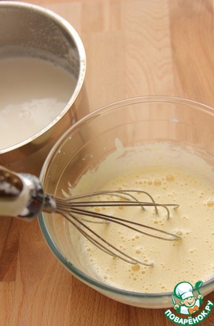 Затем "закалить" желтки. Т. е. влить небольшое кол-во горячего молока в желтки, тщательно размешать и затем влить оставшееся молоко.