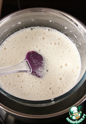 Потом получившуюся смесь подогреть на паровой бане в течении 5 мин, постоянно помешивая. Весь процесс похож на приготовление крема-англеза, но нам ни в коем случае не надо, чтобы крем загустел.