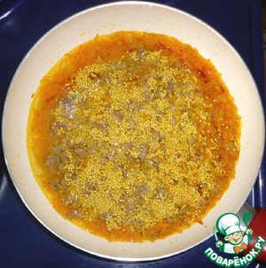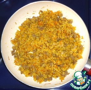 Пшено промыть, добавить к овощам и фаршу, добавить воду и соль. Накрыть крышкой и тушить на медленном огне до готовности.