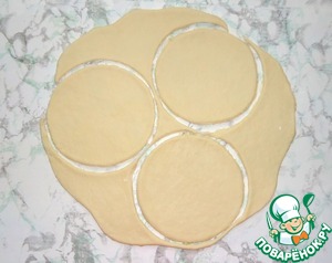 Тесто раскатать в тонкий пласт и с помощью круглой формы (я использовала блюдце) выдавить круги диаметром 14-15 см.