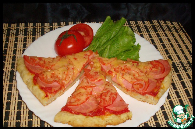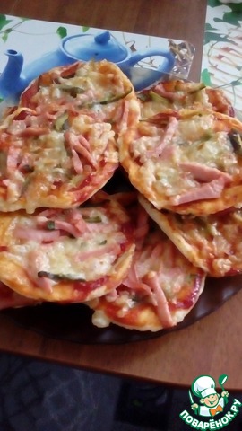 Тесто раскатать толщиной в 3 мм. Вырезать кружки в диаметре примерно 10 см. Выложить на противень, застеленный пергаментом. Каждую лепешку смазать томатным соусом. Сверху распределить начинку, слегка придавливая в тесто. Выпекать в разогретой до 180 гр. духовке примерно 15 минут.