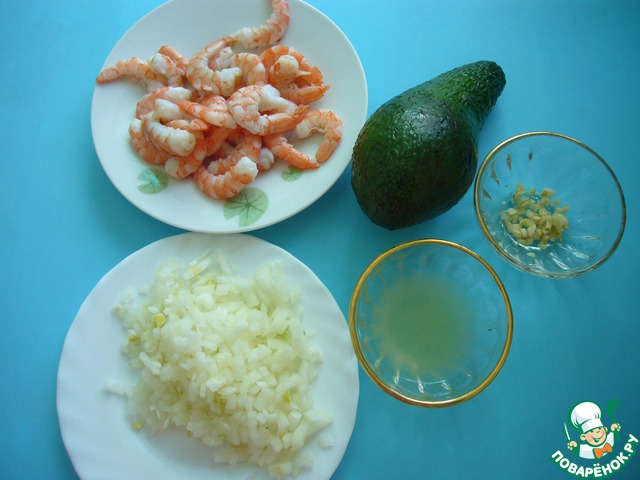 Для подливы понадобятся очищенные креветки, мелко нарезанные лук, чеснок, лимонный сок и авокадо, молотый мускатный орех, соль, коньяк, сливки.
