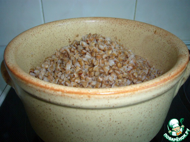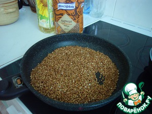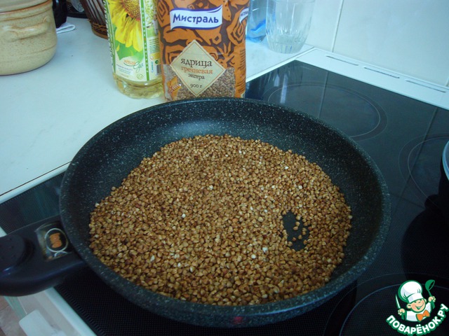 Надеюсь, что практически все знают правила приготовления гречки, я не снимала все этапы варки, только перечислю их: гречку перебрать, промыть в 2-3-х водах. Обжарить гречку на раскаленной сухой сковороде до золотистого цвета.
