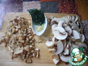 Нарезать грибы: ножки - мелко (для бульона), шляпки - тонкими ломтиками; чеснок и укроп - мелко нарезать.