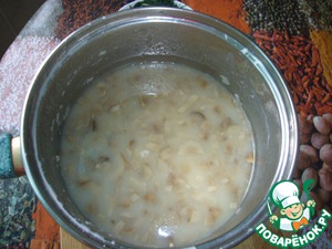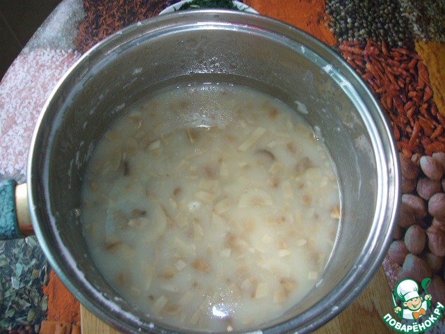 Мелко нарезанные грибы (ножки) залить холодной водой, довести до кипения, варить 5 минут. Готовый бульон накрыть крышкой и оставить минут на 20 остывать. В охлажденный бульон добавить при постоянном помешивании муку (комков быть не должно).