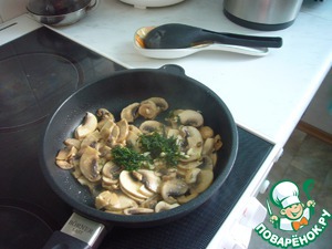 Для приготовления подливы нарезанные ломтиками грибы, обжарить на оливковом масле. при жарке добавить сливочное масло, мелко нарубленный чеснок и зелень укропа.