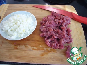 Говядину - нарезать маленькими кусочками, лук - мелко.