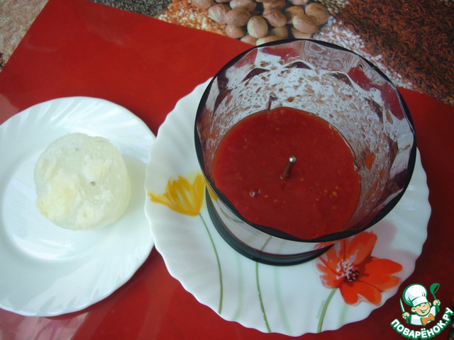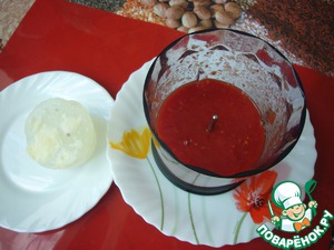 Помидоры в собственном соку очистить от кожицы, взбить в блендере, приготовить мясной бульон - я воспользовалась замороженным.