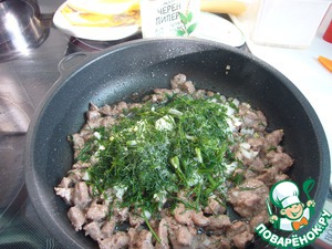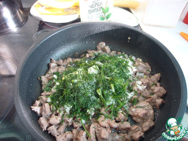 Мясо обжарить на оливковом масле, через 5 минут добавить лук, укроп, соль и перец, готовить еще минуты три.