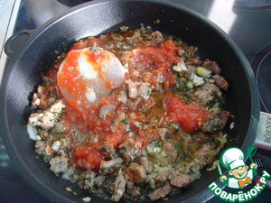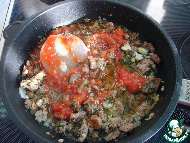 Влить (я просто положила, не размораживая) мясной бульон и измельченные помидоры. Тушить под крышкой еще 5 минут.