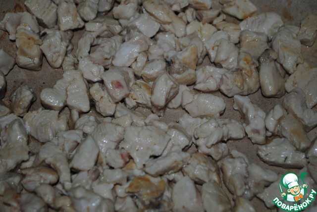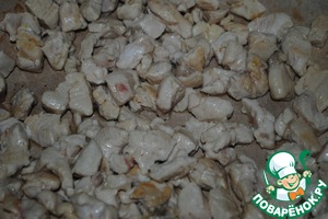 На той же сковороде, где жарили лук обжариваем куринную грудку до белого цвета.