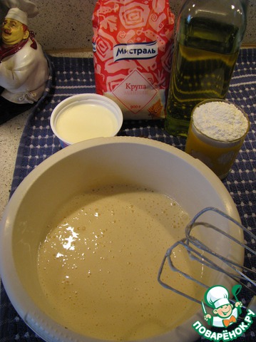 Взбиваем миксером яйца и сахар, затем добавляем сметану, масло, манную крупу "Мистраль". Все перемешиваем. Муку смешиваем с разрыхлителем и с ванильным сахаром и добавляем к остальным продуктам. Взбитую смесь оставляем минут на 10 чтобы разбухла манка.
