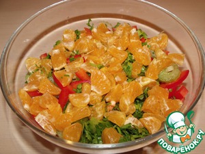 • Очистить мандарины, порезать каждую дольку на 4 кубика. Покрошить кинзу. Рис отварить, добавить в салат.