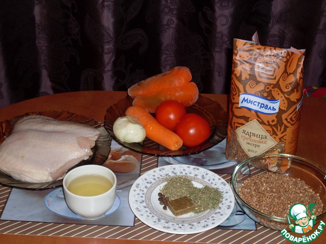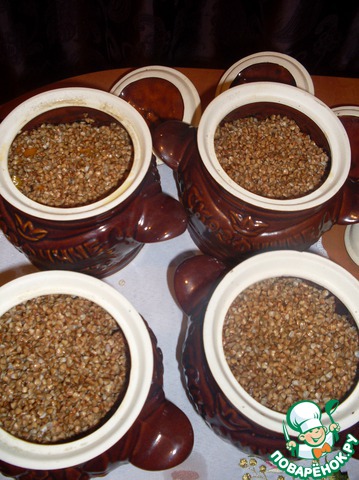 Затем раскладываем гречневую крупу по горшочкам, так, чтобы горшочек был заполнен чуть больше половины.