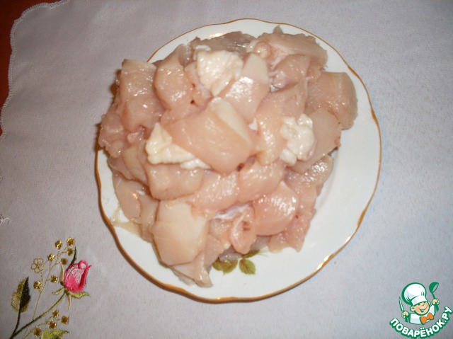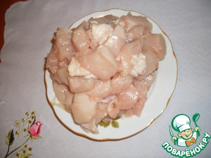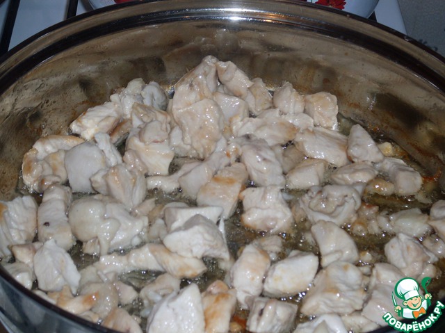 Кусочки куриного мяса обжариваем в масле до золотистого цвета.
