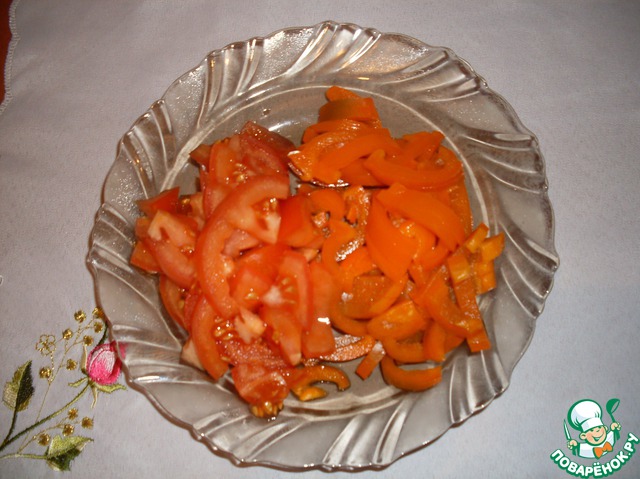 Помидоры и перцы нарезаем на тонкие ломтики.