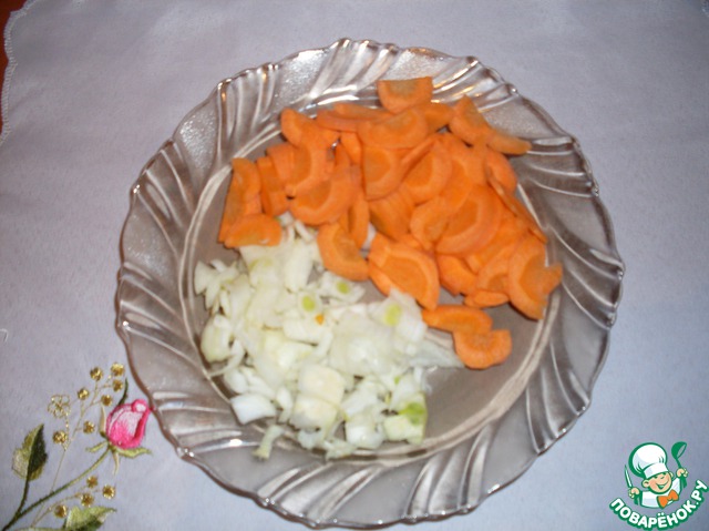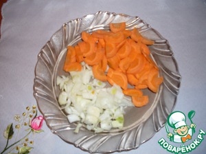 Морковь разрезаем вдоль, затем половинки режем на полукольца. Лук также режем на полукольца.