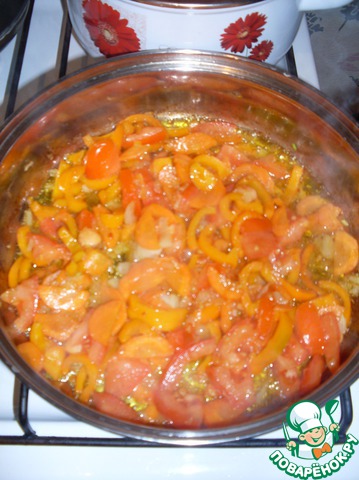 На том же масле (при необходимости добавляем еще) обжариваем около 5 мин лук и морковь. Затем туда же добавляем болгарский перец и помидоры. Жарим еще минут 5.