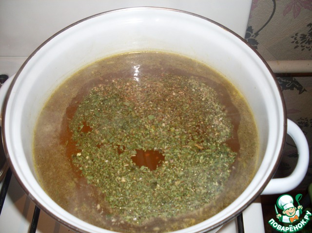 Готовим бульон. В 1 литр кипящей воды кладем бульонный кубик, специи и соль. Кипятим 1-2 мин.