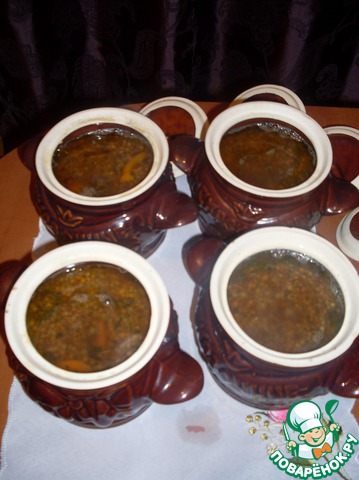 Этим готовым бульоном заливаем горшочки, не доливая до краев 1-1,5 см.