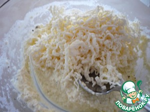 Плавленый сыр натереть на мелкой терке, добавить к предыдущей массе и перемешать.