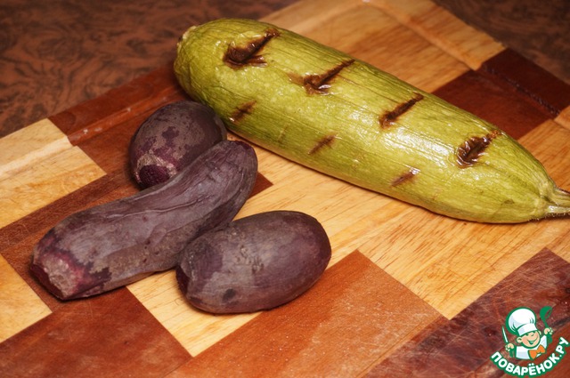 • Свеклу отварить или запечь, кабачок натереть маслом и запечь в духовке при 220 г.