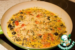 4. Влить сливки или молоко. Добавить базилик и тмин. Можно смесь итальянских трав. Тушить пару минут, помешивая.
