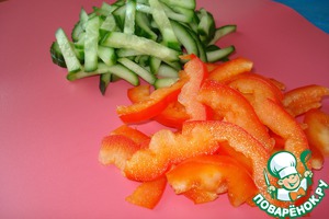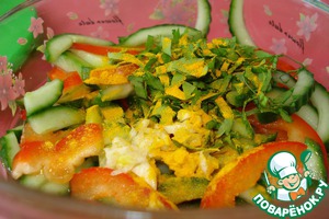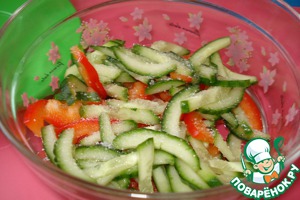 Всё переложим в салатник и совсем чуть-чуть посолим, чтобы огурцы с перцем отдали лишнюю воду.