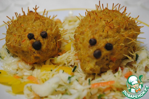 6. Начинаем украшать котлеты. Берем сухую (не вареную) вермишель и вставляем иголочки. А из перца глазки и носик.
