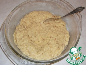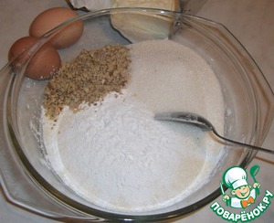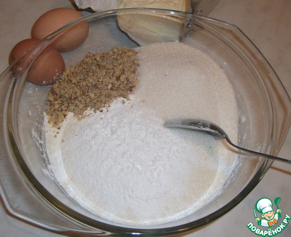 Сначала включаем духовку! Смешиваем манку, крахмал, грецкие орехи (я их измельчила скалкой), сахар и ванилин. -
