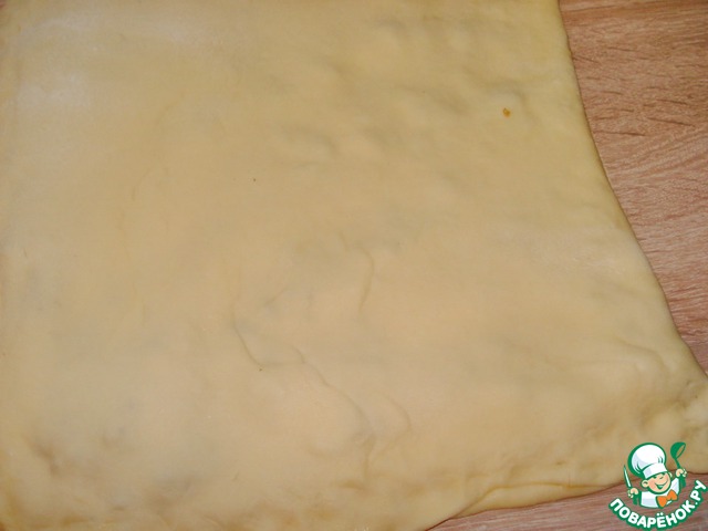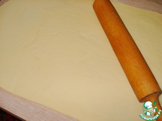Готовое тесто раскатаем в прямоугольник размером примерно больше формы для выпечки в 2 раза. Визуально разделим прямоугольник по длине на 2 равные части.