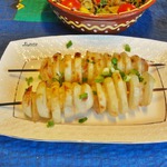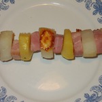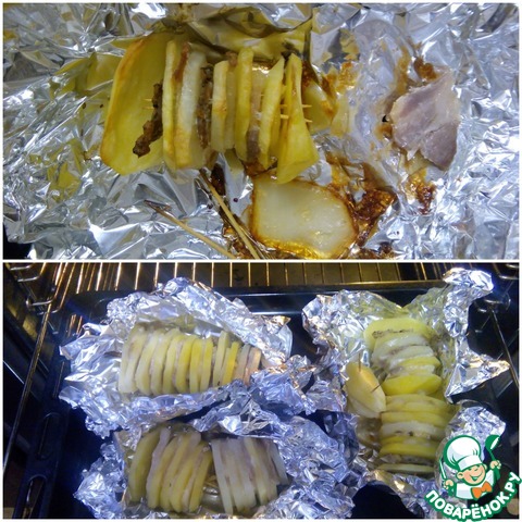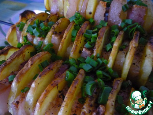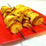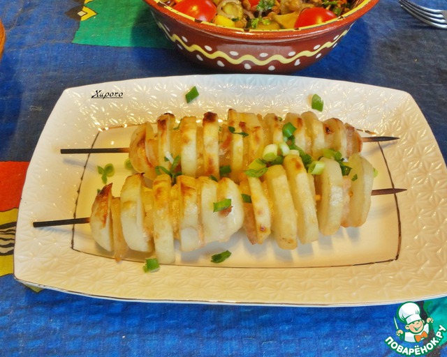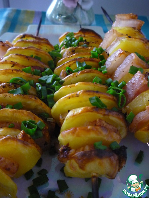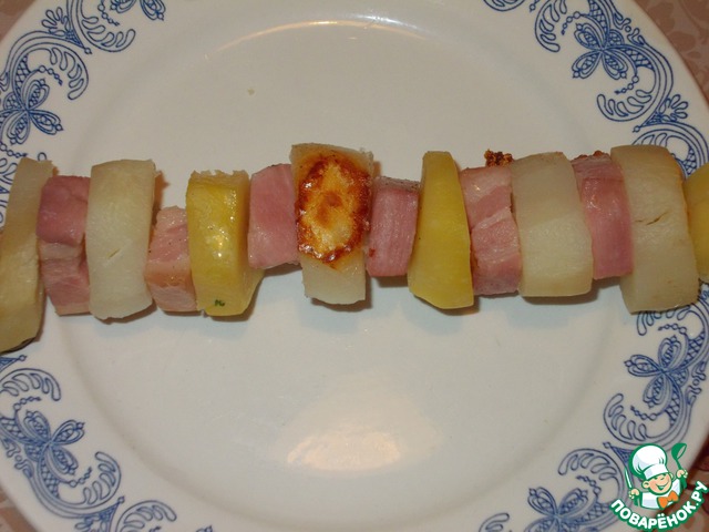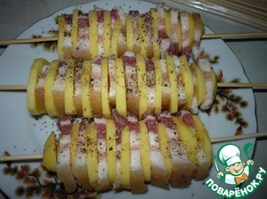 На деревянную шпажку нанизываем картофель, сало, картофель, сало и т. д.