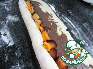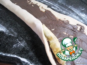 • Когда тесто подойдет, раскатать его и смазать шоколадной пастой. На один край положить банан, сделать один виток.