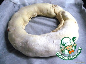 • Свернуть улиткой или кольцом, смазать яйцом с водой. Поставить в духовку, разогретую до 190°С, на 45-50 минут.