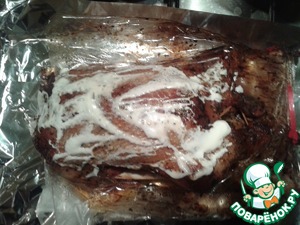 Через 1,5 часа разрезаем рукав сверху, смазываем сметаной и еще 15 - 20 мин в духовку -
