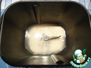 Для замеса теста я использую хлебопечку. Если ее у Вас нет - ничего страшного, тесто можно замесить руками. В ведерко хлебопечки наливаем теплую воду, добавляем дрожжи.
