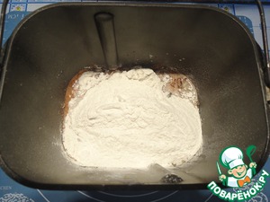 Затем в ведерко добавляем просеянную муку и какао, сахар, соль, желток, размягченное сливочное масло.