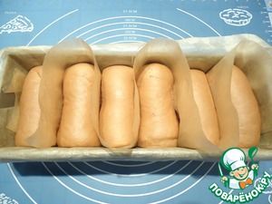 В оригинальном рецепте для выпечки маленьких буханочек использовались формочки размером 10*5 см, у меня таких нет, поэтому я попробовала испечь их в форме для кекса, которая имеет размер 10*30 см. Сначала я застелила форму пергаментом, смазала маслом.