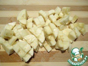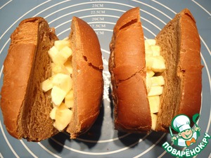 Укладываем в разрезы кубики бананов, поливаем карамельным соусом.