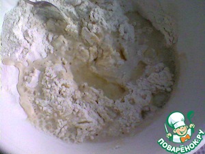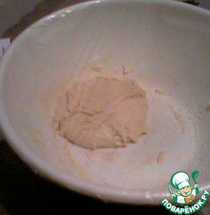 150г муки просеять в миску, добавить дрожжи, растворенные в 100 мл теплой воды. Замесить тесто.