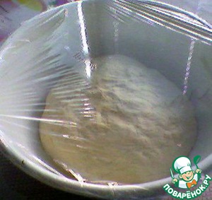 Замесить тесто, положить его в миску, сверху прикрыть крышкой или пищевой пленкой. Можно еще укутать полотенцем и поставить в теплое место для подъема на пару часов.