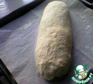 На столе, присыпанном мукой, сформовать батон, положить его на лист для выпекания, сверху прикрыть полотенцем и оставить на 30 мин в теплом месте.