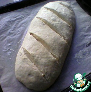 Затем на батоне острым ножом сделать косые надрезы, смазать водой и поставить в горячую духовку - темп. 220 - 250 град - выпекать 10 мин, затем снизить темп. до 200 град. и выпекать до готовности 40-45 мин.